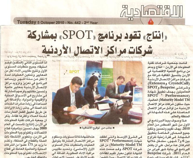 5 أغسطس 2010- عمان، قامت جمعية شركات تقنية المعلومات في الأردن - انتاج وبدعم من الوكالة الأمريكية للتنمية الدولية من خلال برنامج التنمية الإقتصادية في الأردن بتنسيق اتفاقية شراكة مع شركات مراكز الاتصال الأردنية (CrystelCall و Extensya) وشركتي Benprise و SPOT العالميتين بهدف تطبيق شهادة (SPOT ® Performance Maturity Model TM) العالمية، حيث ستكون شركات مراكز الاتصال الاردنية من أوائل مراكز الاتصال الحاصلة على هذه الشهادة في المنطقة والعالم.
